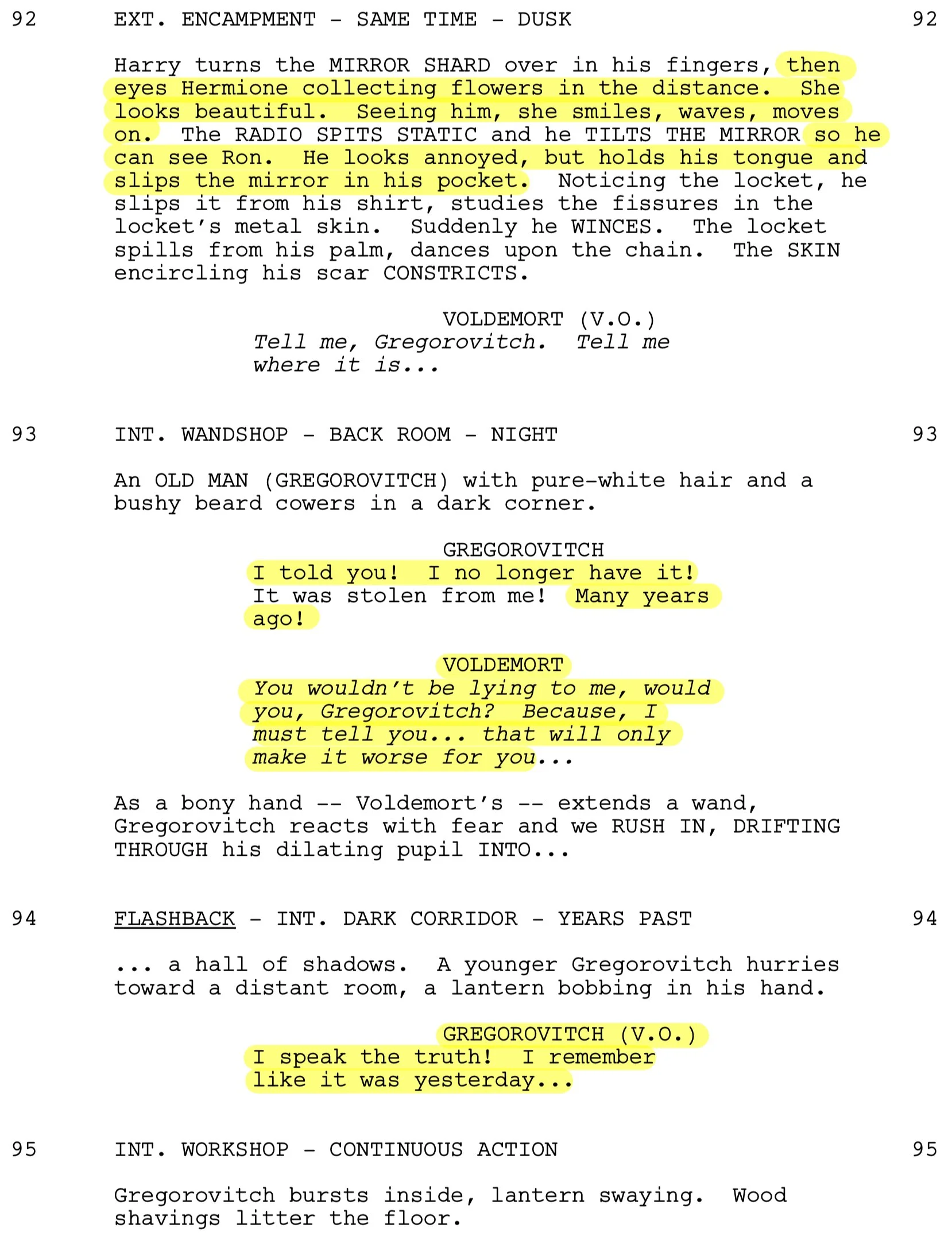 The scene with Bathilda Bagshot is extended in the script. It reveals that there were Snatchers in Godric’s Hollow and that the locket starts trembling slightly when Bathilda is near. Hermione also mentions that there is something odd about her. Hermione notices a photograph of Ariana Dumbledore, while Harry finds a picture of a boy he recognizes from Gregorovitch's wand shop. Bathilda gestures for them to go upstairs but insists that Harry comes alone.